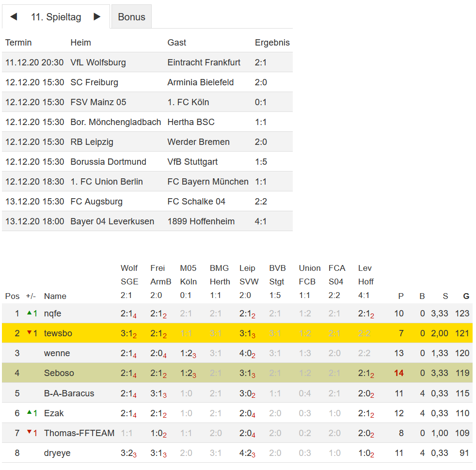 Stand 11. Spieltag - NI-Tippspiel zur Fussball-Bundesligasaison 2020/21