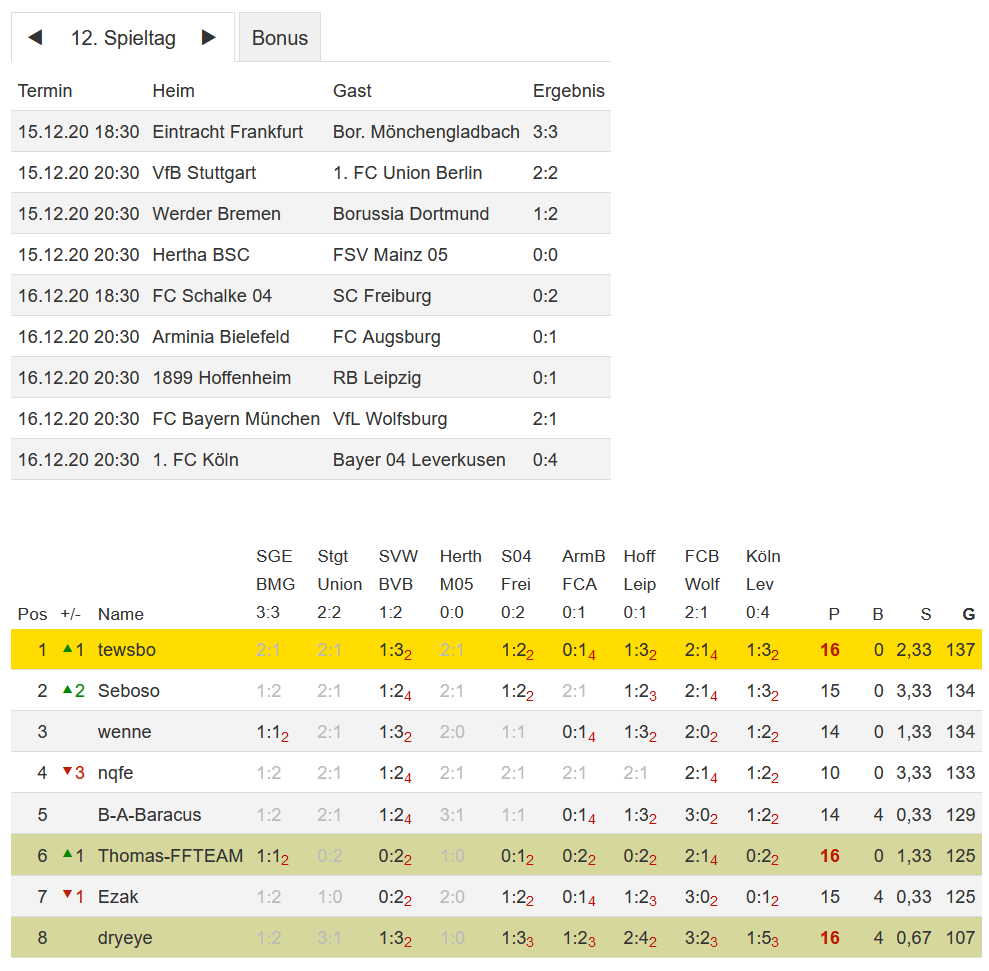 Stand 12. Spieltag - NI-Tippspiel zur Fussball-Bundesligasaison 2020/21
