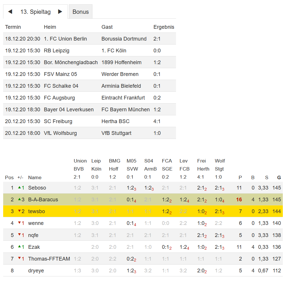 Stand 13. Spieltag - NI-Tippspiel zur Fussball-Bundesligasaison 2020/21