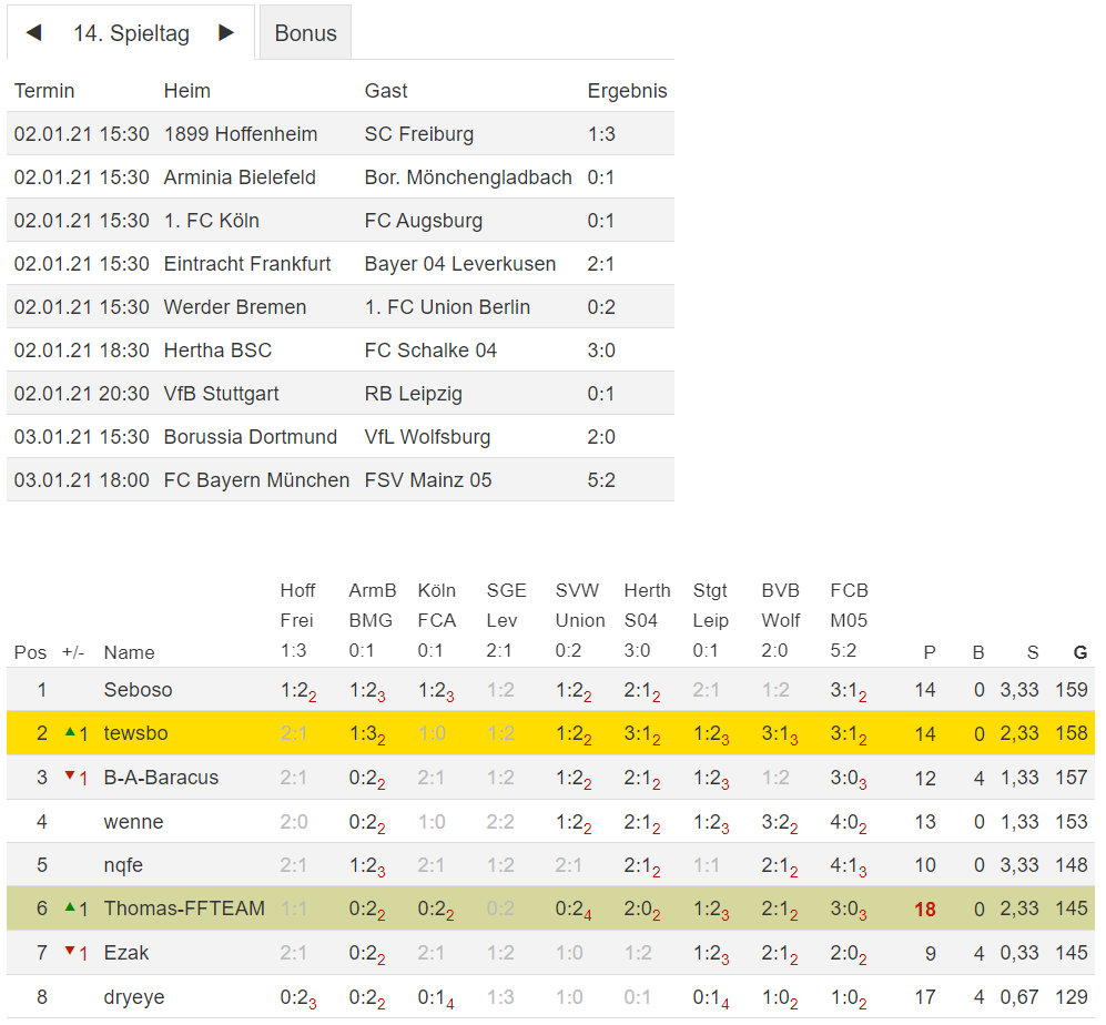 Stand 14. Spieltag - NI-Tippspiel zur Fussball-Bundesligasaison 2020/21