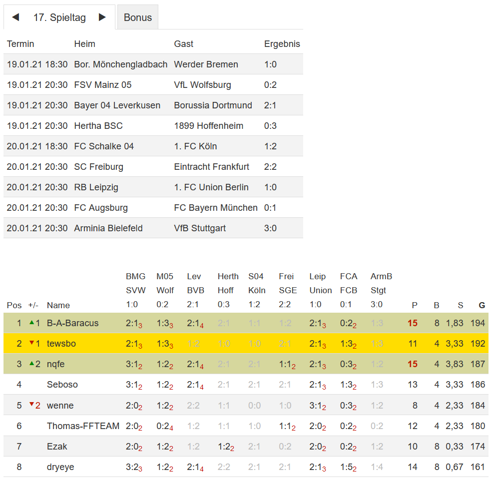 Stand 17. Spieltag - NI-Tippspiel zur Fussball-Bundesligasaison 2020/21