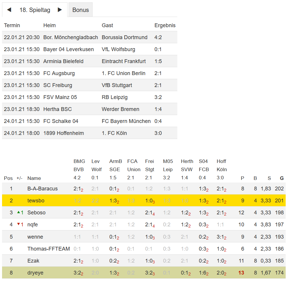 Stand 18. Spieltag - NI-Tippspiel zur Fussball-Bundesligasaison 2020/21
