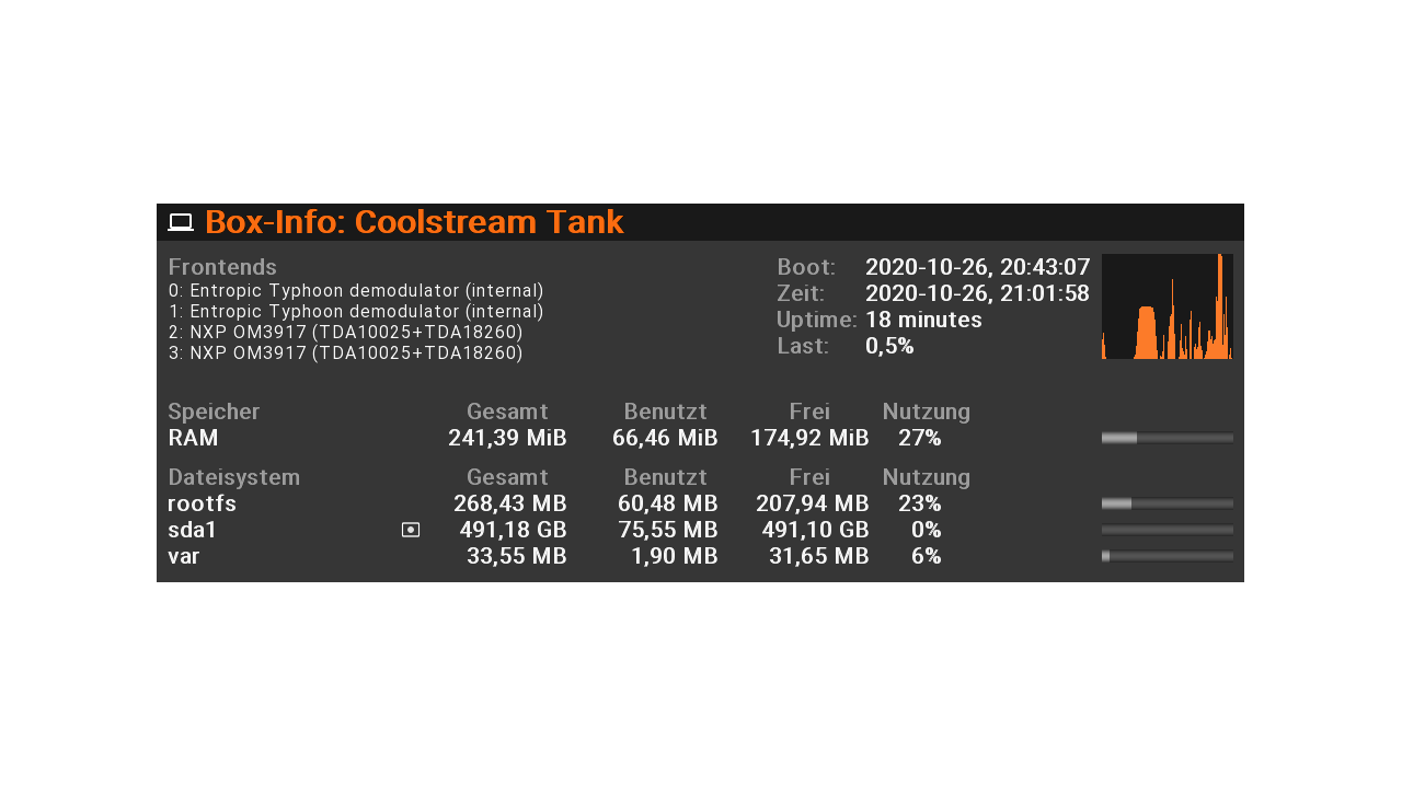 die box hat zwei sat- und zwei kabeltuner (siehe screenshot boxinfo) und eine 500gb hitachi platte verbaut.
