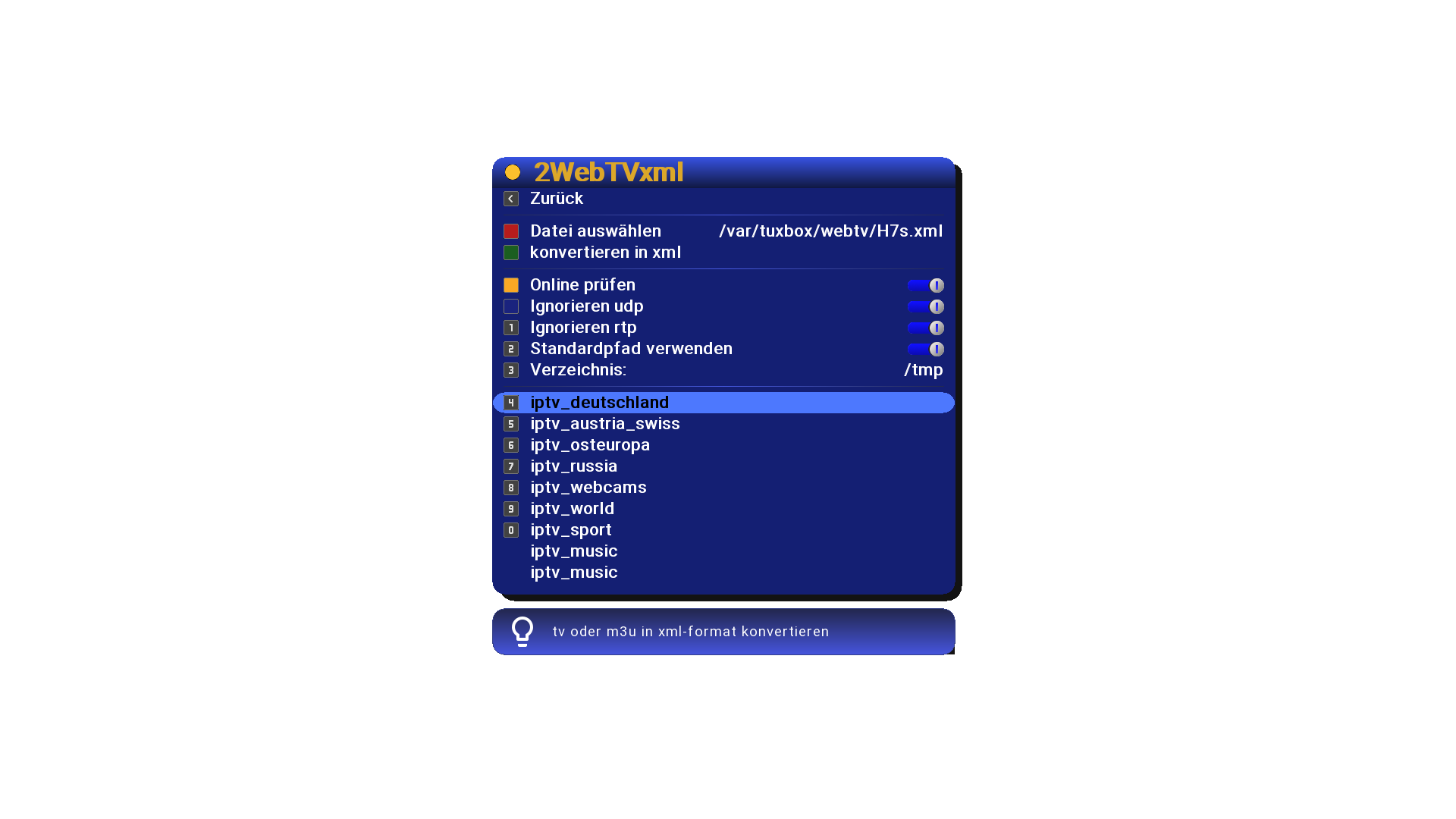 du kannst z.b. auf iptv_deutschland gehen und ok drücken....dann wird eine liste in den angebenen pfad (z.b. /tmp) generiert.
