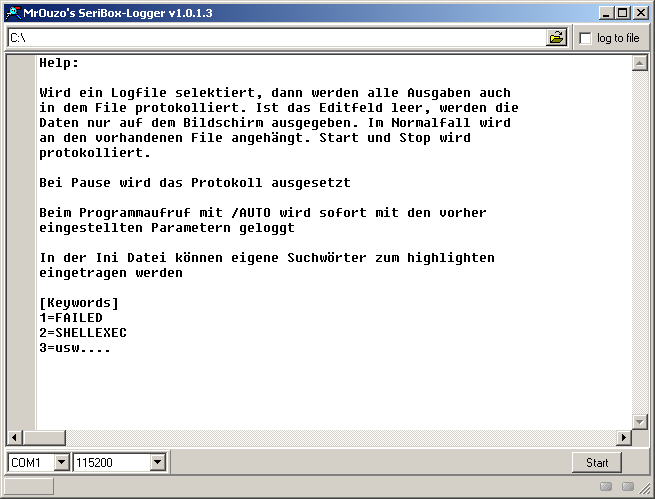 Oben kann man einen Speicherort festlegen, wohin das Log (zusätzlich zur Bildschirmausgabe) geschrieben werden soll, wenn man oben-rechts das Häkchen bei "log to file" setzt. Das ist bei längeren und damit grösseren Logs von Vorteil.