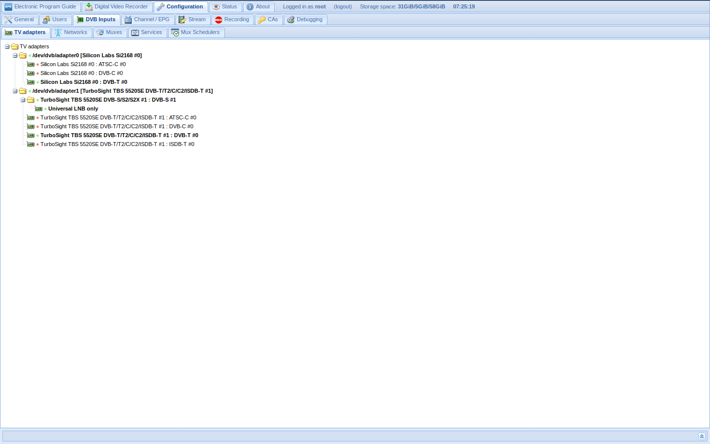 Angeschlossen an dem RPI4 sind 2 Tuner, wo es arge Probleme gab, die vernünftig ans laufen zu bekommen.