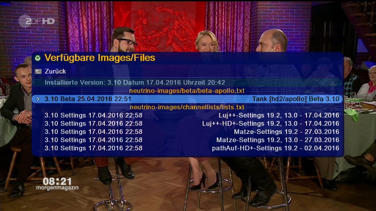 Seit gestern abend liegen neue Images auf dem Server. Die Benutzer von HD1, BSE, Neo, Neo², Zee, Tank, Zee² und Trinity V2 können - wie gewohnt - ein Online-Update durchführen.