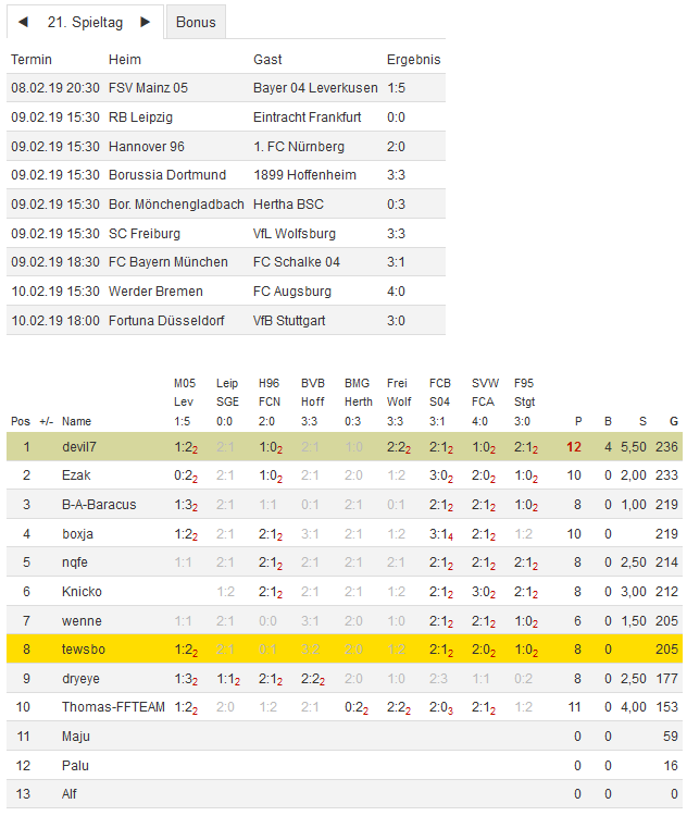 Stand 21. Spieltag - NI-Tippspiel zur Bundesligasaison 2018/19