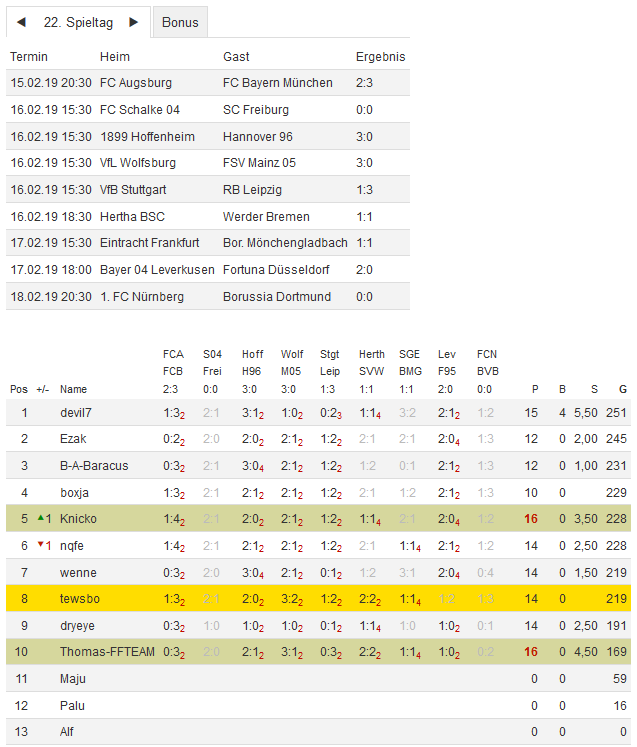 Stand 22. Spieltag - NI-Tippspiel zur Bundesligasaison 2018/19