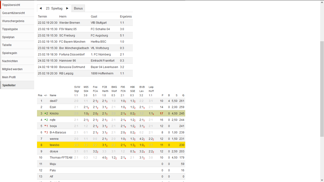 Stand 23. Spieltag - NI-Tippspiel zur Bundesligasaison 2018/19
