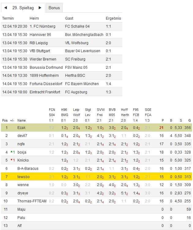 Stand 29. Spieltag - NI-Tippspiel zur Bundesligasaison 2018/19