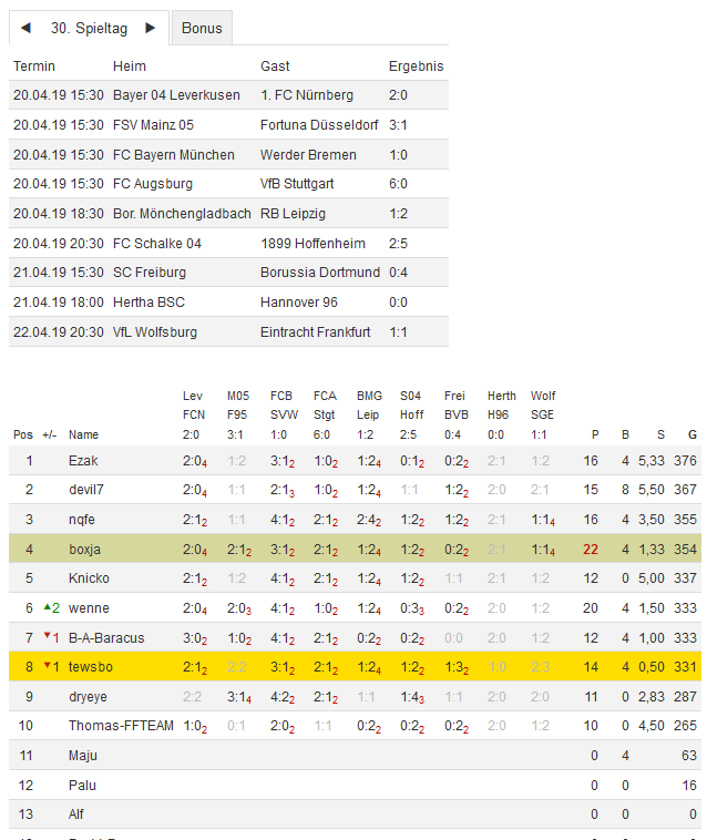 Stand 30. Spieltag - NI-Tippspiel zur Bundesligasaison 2018/19