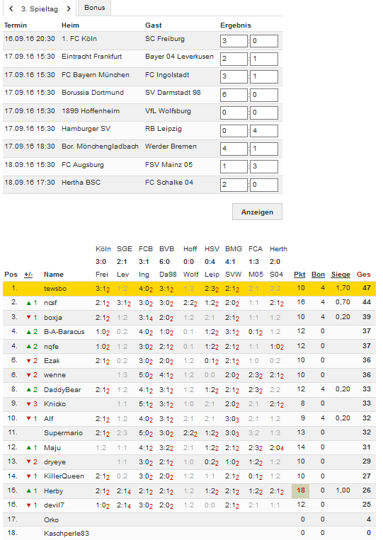 Stand 03. Spieltag - NI-Tippspiel zur Bundesligasaison 2016/17