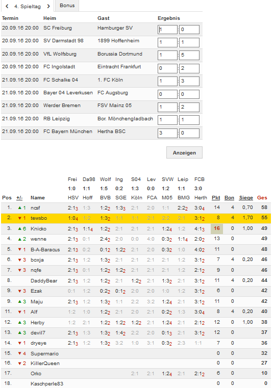 Stand 04. Spieltag - NI-Tippspiel zur Bundesligasaison 2016/17