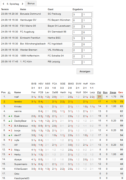 Stand 05. Spieltag - NI-Tippspiel zur Bundesligasaison 2016/17