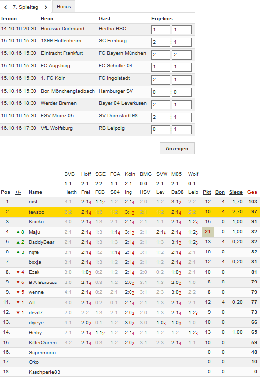 Stand 07. Spieltag - NI-Tippspiel zur Bundesligasaison 2016/17