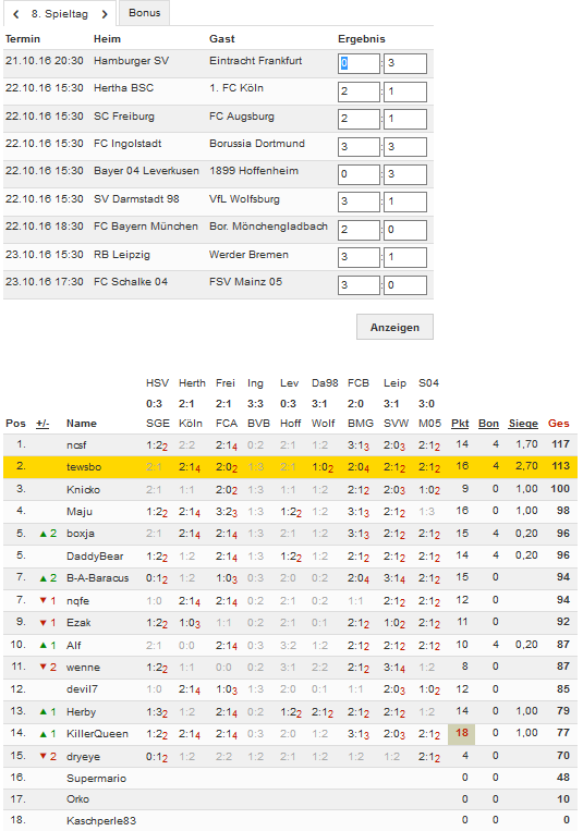 Stand 08. Spieltag - NI-Tippspiel zur Bundesligasaison 2016/17