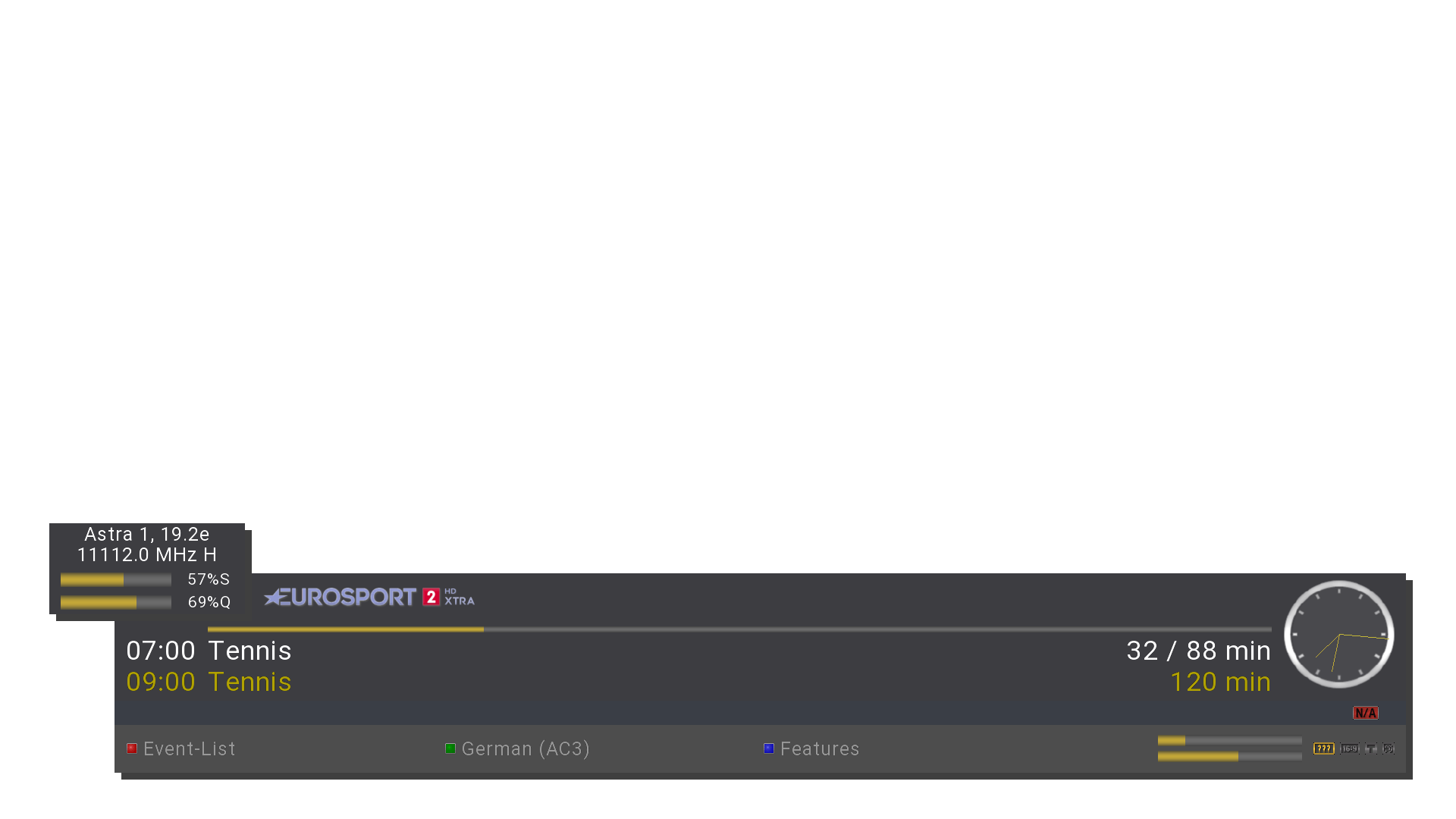 Sowohl mit dem Nightly vom 13.01. wie auch mit dem aktuellen von heute morgen, funzt die Kodiersystemerkennung auf Eurosport-2-HD-XTRA nicht. Ichhabe jetzt keinen anderen Sender gefunden, wo das der Fall ist, aber bei diesem Sender will das nicht. Das ein oder ausschalten zusätzlicher Hintergrundprogramme ändert daran ebenfalls nichts. Es liegt also nicht daran, dass das gelebe N-Icon (Nagra) nicht vorhanden ist, auf anderen Sendern kommt es wie erwartet.