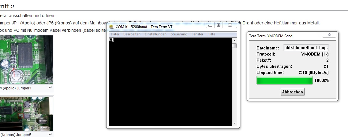Das Problem ist, sie zeigt zwar das "C" über die Schnittstelle, nimmt aber den "uldr.bin.uartboot_img" Tera Term: File -> Transfer -> YMODEM -> send nicht an.