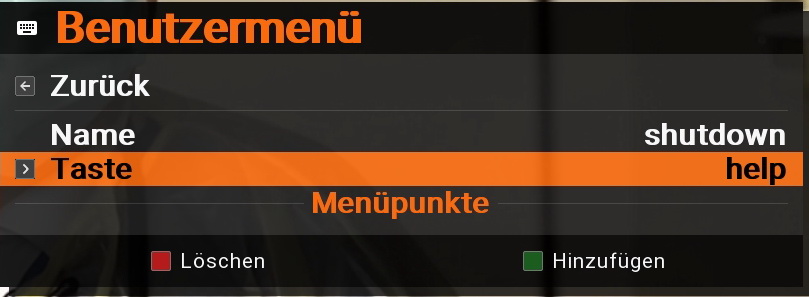 Man muss im Benutzermenü auch nochmal Hinzufügen drücken, es erscheint dann ein Eintrag, diesen dann anklicken und jetzt kann man das shutdown.so Plugin auswählen. Wenn man dann beim Namen shutdown.so (wobei .so muss da gar nicht drin stehen) einträgt wird der Name auch gespeichert und man sieht beim herausgehen das shutdown.so hinter help steht.