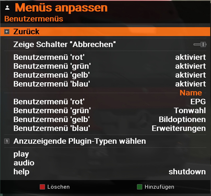 Unter /var/tuxbox/plug-ins ein Skript shutdown.so angelegt mit folgendem Inhalt:Dann unter "benutzermenü-Menüs anpassen" das Skript einer von mir nicht genutzten Fernbedienungstaste zugeordnet (die help Taste meiner vu+ duo 4k).Code: Alles auswählen
