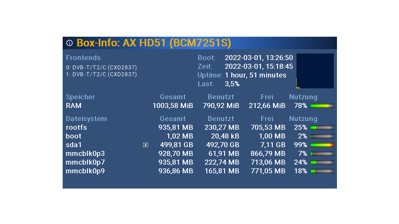 Hallo , habe in der letzten Zeit mehrere Nightly-Images in meine HD51 geflasht und festgestellt das die Last in der Box-Info sehr hoch wurde , im Moment bei über 56 % , im Image vorher bei 33 % , siehe Screenshot ...