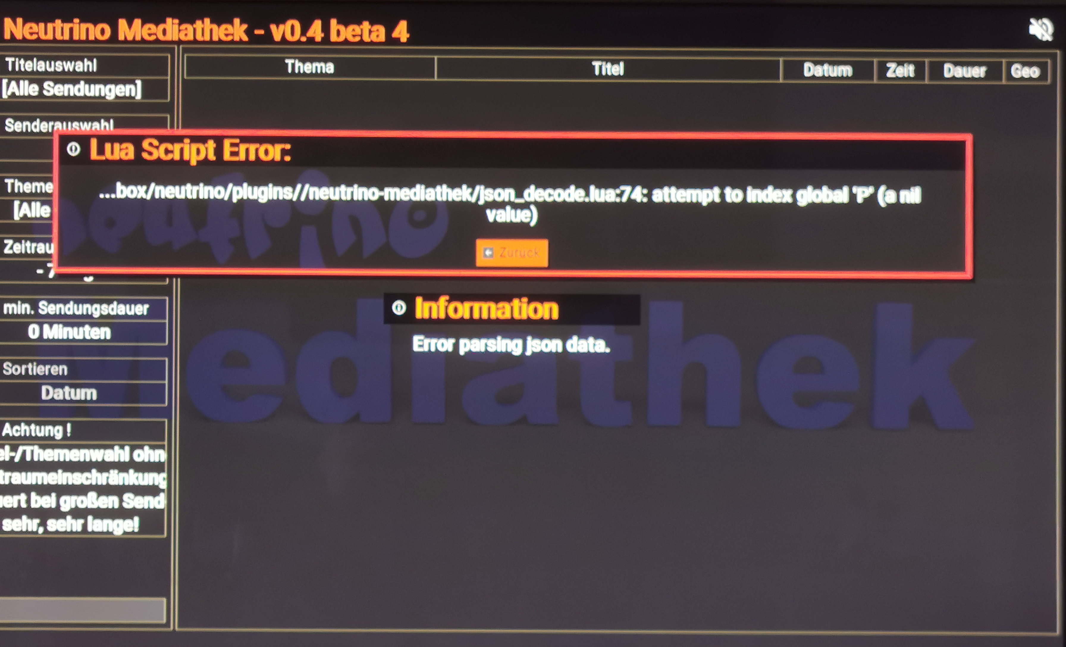 Hinzu kommt dann noch ein weiteres Problem das ich aber jetzt nicht immer verifizieren kann. Die Neutrino Mediathek bringt mir einen Lua error (Phasing error) in der Anzeige.