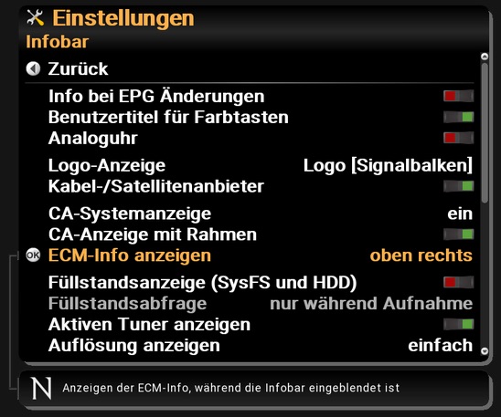 Die Funktion show_ecm=1 eingestellt unter Menü Einstellungen OSD Infobar ECM-Info anzeigen,
