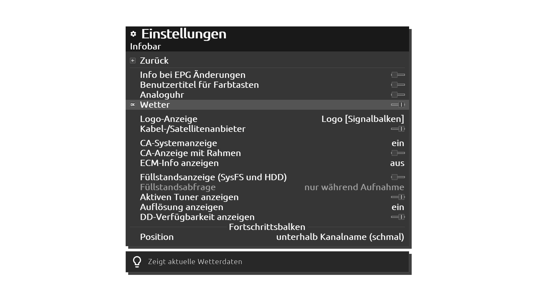 zur Anzeige des Wetters mit der Infobar wäre es schön wenn es zuschaltbar machbar wäre.