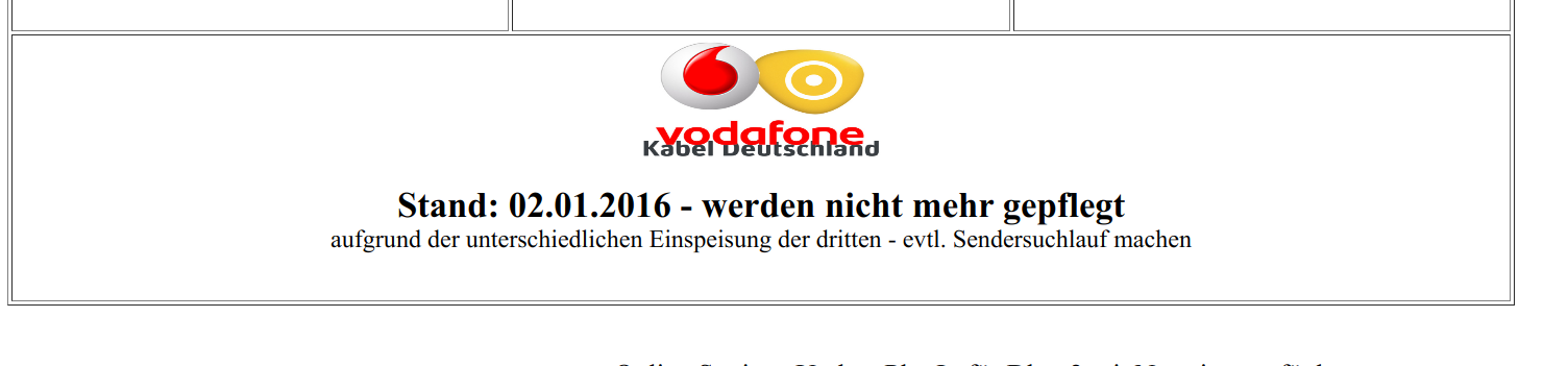 12437 MHz Sender ohne Kennung abgeschaltet, Ch.-ID: 1; Sender ohne Kennung abgeschaltet, Ch.-ID: 2; Sender ohne Kennung abgeschaltet, Ch.-ID: 3; Sender ohne Kennung abgeschaltet, Ch.-ID: 8; Sender ohne Kennung abgeschaltet, Ch.-ID: 9; Sender ohne Kennung abgeschaltet, Ch.-ID: 12; Sender ohne Kennung abgeschaltet, Ch.-ID: 13; Sender ohne Kennung abgeschaltet, Ch.-ID: 14; Sender ohne Kennung abgeschaltet, Ch.-ID: 15; Sender ohne Kennung abgeschaltet, Ch.-ID: 16; Sender ohne Kennung abgeschaltet, Ch.-ID: 17; Sender ohne Kennung abgeschaltet, Ch.-ID: 21; Sender ohne Kennung abgeschaltet, Ch.-ID: 25; Sender ohne Kennung abgeschaltet, Ch.-ID: 32; Sender ohne Kennung abgeschaltet, Ch.-ID: 33; Sender ohne Kennung abgeschaltet, Ch.-ID: 35; Sender ohne Kennung abgeschaltet, Ch.-ID: 60; Sender ohne Kennung abgeschaltet, Ch.-ID: 61; Sender ohne Kennung abgeschaltet, Ch.-ID: 62; Sender ohne Kennung abgeschaltet, Ch.-ID: 63; Sender ohne Kennung abgeschaltet, Ch.-ID: 64; Sender ohne Kennung abgeschaltet, Ch.-ID: 65; Sender ohne Kennung abgeschaltet, Ch.-ID: 66; Sender ohne Kennung abgeschaltet, Ch.-ID: 69