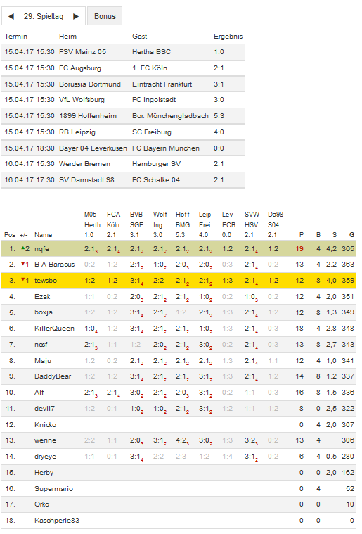 Stand 29. Spieltag - NI-Tippspiel zur Bundesligasaison 2016/17