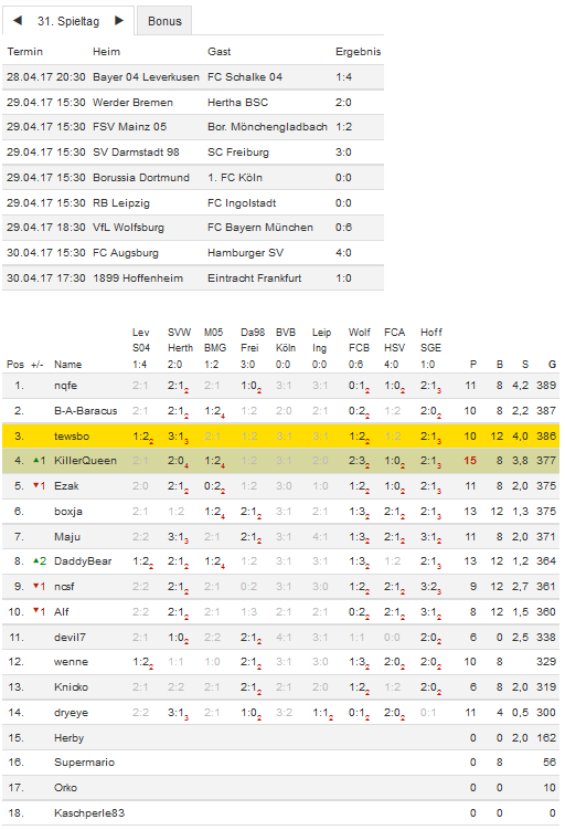 Stand 31. Spieltag - NI-Tippspiel zur Bundesligasaison 2016/17