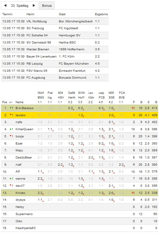Stand 33. Spieltag - NI-Tippspiel zur Bundesligasaison 2016/17