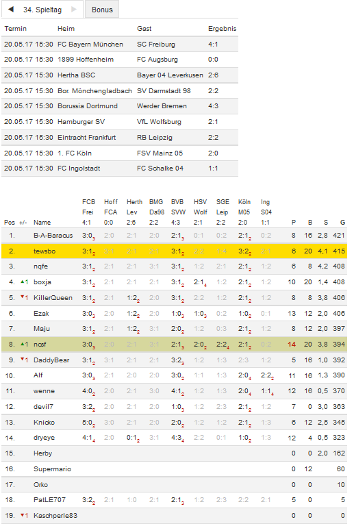 Stand 34. Spieltag - NI-Tippspiel zur Bundesligasaison 2016/17