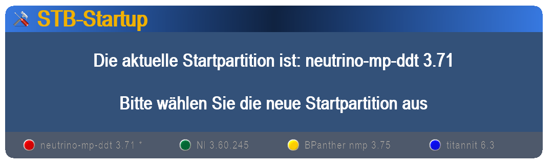 Und siehe da > es bootet und auch da sind die 'E2-Spielregeln' drinne, so dass es im Neutrino stb-startup.lua angezeigt wird. Innerhalb Titan kann man auch zu den anderen Image zurückschalten, es werden aber keine Namen angezeigt nur : STARTUP_1 / _2 / _3 / _4.