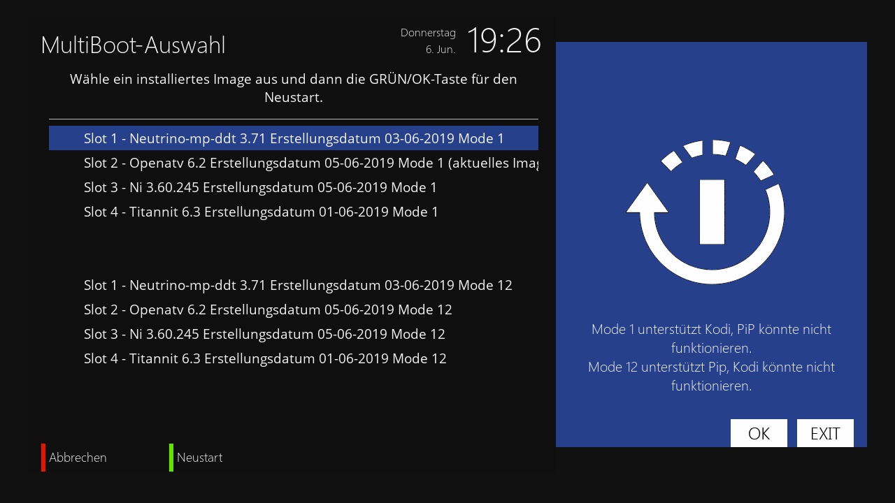 Mit neuen Bootloader r27 ein Enigma mit neuen Layout z.B. OpenATV 6.2 auf 1 Partition installiert ist es nicht mehr möglich ein Neutrino Image auf eine andere Partition zu installieren.