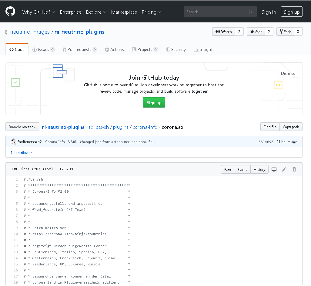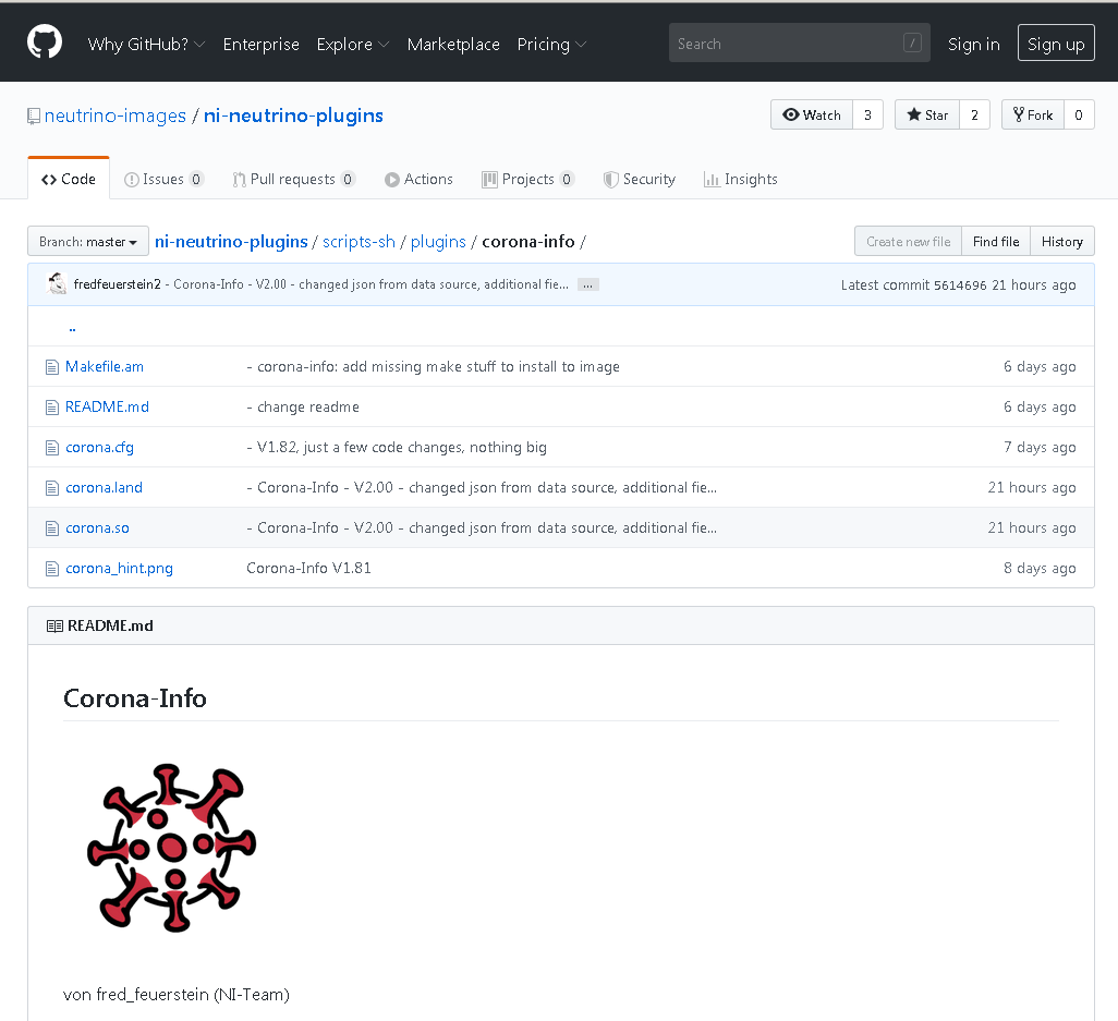 1) zu Fuss: im ersten Post hier ist ja der Link zu dem Github-Repo, damit kommt man dorthin: Dort sieht man zB rechts, welche Dateien und vorallem wann sie geändert wurden, in diesem Fall die corona.land und die corona.so vor 21 Stunden. Bei nur 2 geänderten Dateien lohnt sich das "zu Fuss" ja noch. Dann klickst du jeweils die Datei an, und kommst hierhin: Dort empfehle ich dir mittig rechts auf "Raw" zu klicken, dort dann Rechtsklick->"Alles markieren", dann Rechtsklick->Kopieren für die Zwischenablage, und diese dann in den linux-fähigen Editor deiner Wahl einzufügen und mit passendem Dateinamen abzuspeichern. Der Umweg über "Raw" hat den Vorteil, dass die Zeilenumbrüche erhalten werden sollten, aber die speichert der linux-fähige Editor ja hoffentlich sowieso richtig ab...