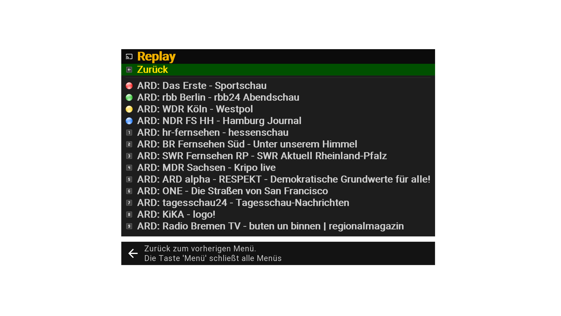 " 2":["ARD Play-Out-Center"], <------> gibt kein replay <------> "31":["3sat","3sat HD"], <------> gibt kein replay <------> "32":["arte","arte HD"], <------> gibt kein replay <------> "34":["phoenix","phoenix HD"], <------> gibt kein replay <------>