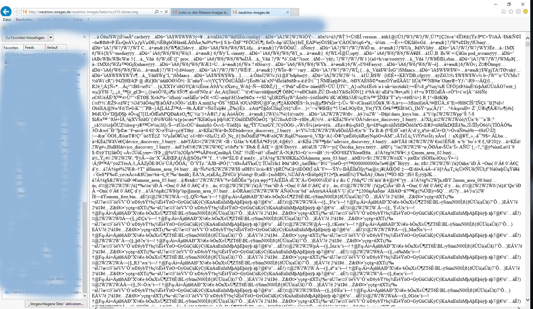 weil der IE11 (warum auch immer), die .bin Datei nicht runterlädt, sondern selbst öffnen will. Und da kommt dann dieses kauderwelsch zustande.