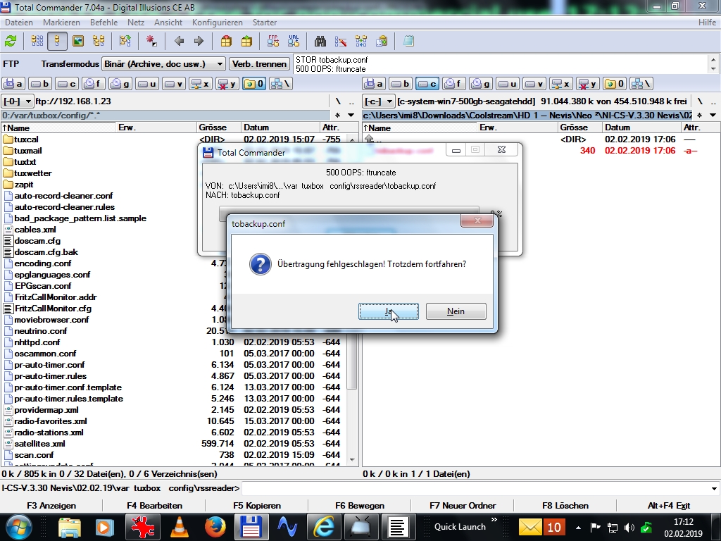 hatte vor nach var/tuxbox/config eine neue Datei " xxx.conf " per FTP zu kopieren schlug fehl , dann habe ich alles neu gestartet , auch den Pc , nochmal probiert , doch kein Erfolg ...