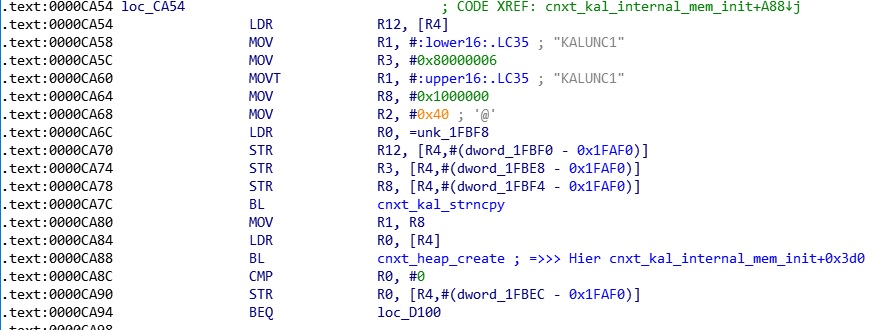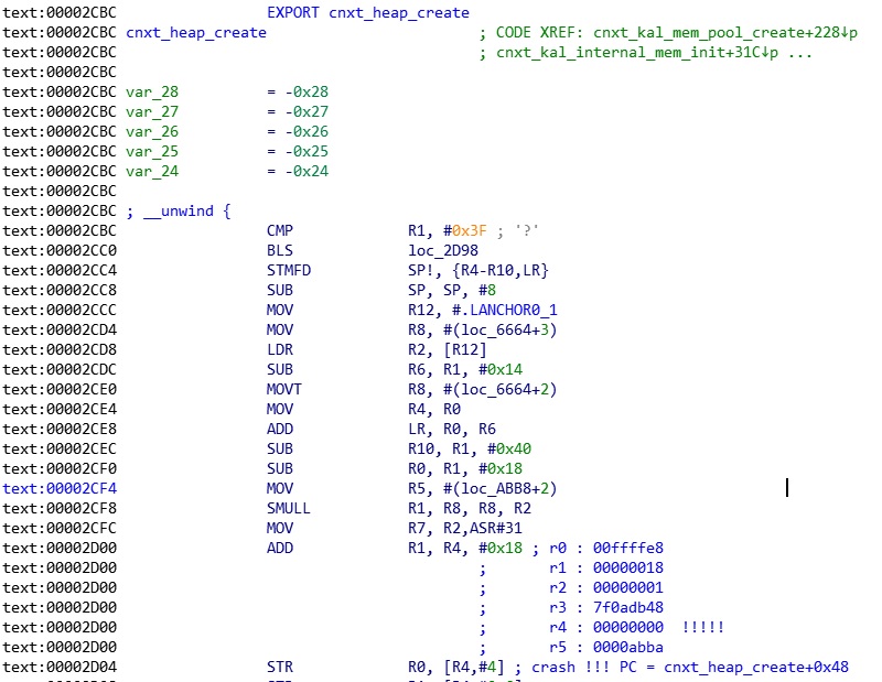 Dort ist Funktion "cnxt_heap_create" aufgerufen. Dann cnxt_heap_create+0x48 haben wir Crash , weil R4 == NULL ist !