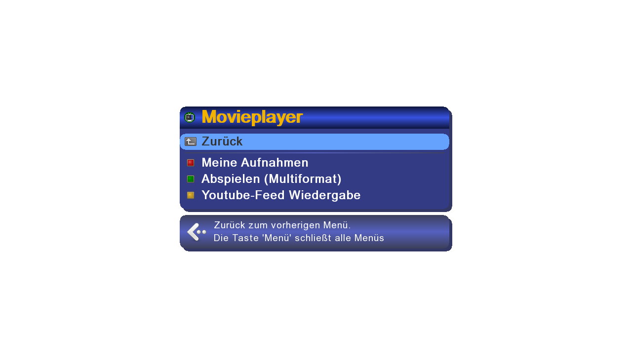 Woher soll der Nutzer/Wechsler wissen, dass "Meine Aufnahmen" alle für die Box möglichen Formate abspielt? Weil der Name es nicht sagt? Weil es keinen erklärenden Text im Menü dazu gibt?