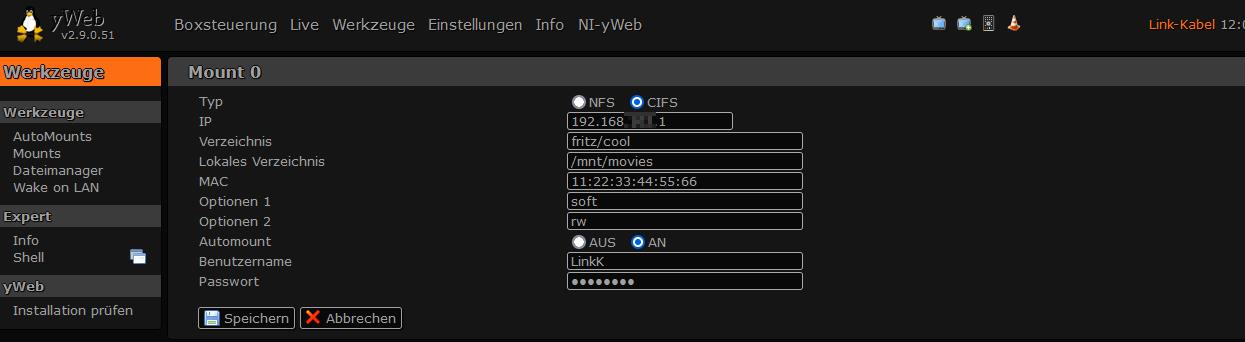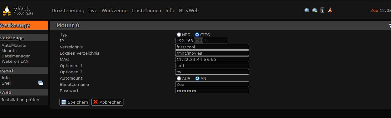 Alle Coolstreams dann identisch (bis auf den jeweiligen Fritz-Benutzernamen) über das yWeb für den Mount konfiguriert.