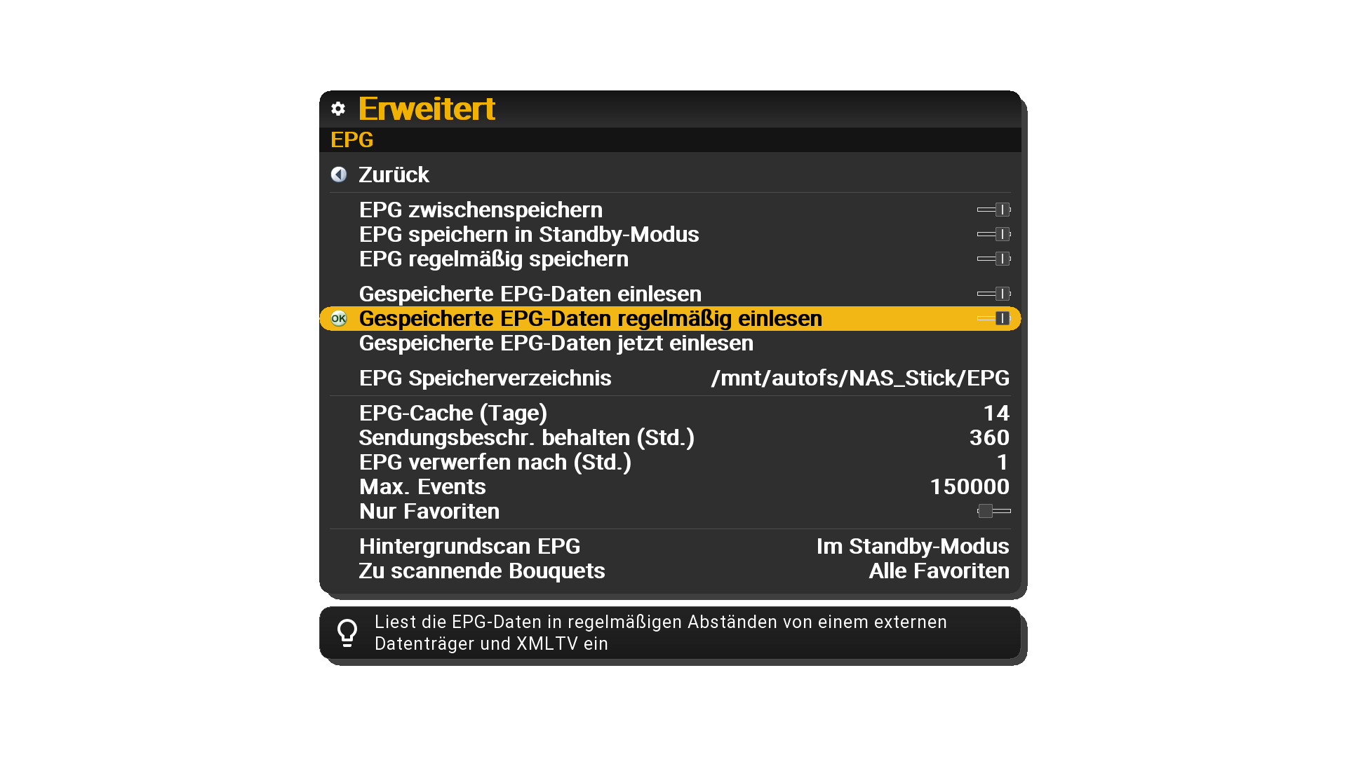 Wenn ich dann in den EPG-Einstellungen manuell "Gespeicherte EPG-Daten jetzt einlesen" ausführe, dann sind die EPG-Daten da.