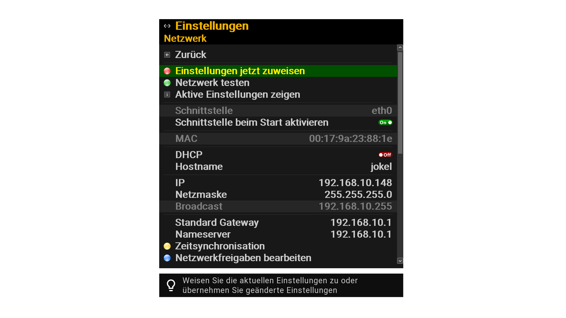 .. ich gebe bei den Netzwerkeinstellung die gewünschte IP und die restlichen Parameter ein (eventuell zuerst DHCP und dann IP auf die gewünschte setzten)).