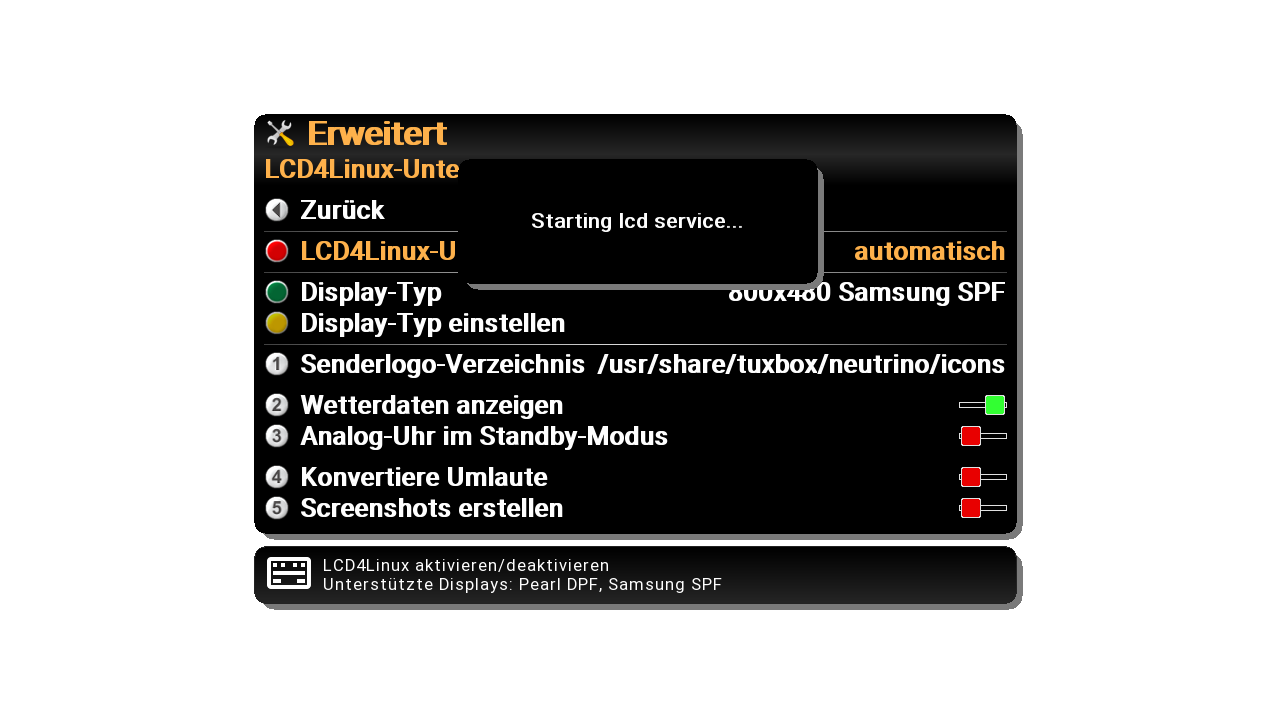 Wenn der Auto-Mode von lcd4linux korrekt arbeitet, sollte der SPF mit einem "service lcd4linux restart" an der Console erkannt werden.04E8:2037